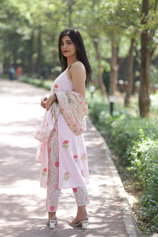 Pink Floral Kurta Set with Fishcut Bottom and Soft Mulmul Dupatta