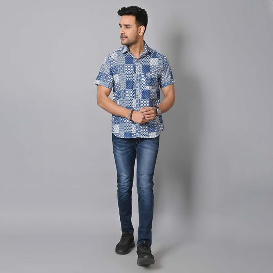 Indigo Blue Patch Work Printed Half Sleeves Shirt.
