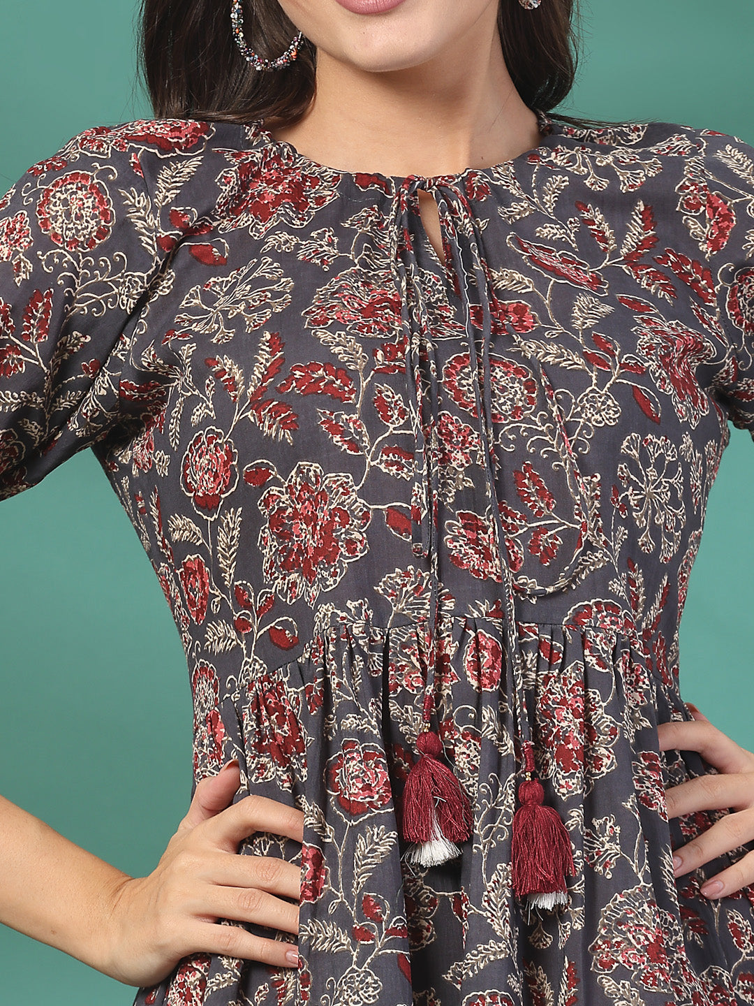 The highlight of this piece is its stylish tassel tie-up neckline, giving it a playful yet graceful appeal. The flowy silhouette enhances movement and offers a flattering fit, making it perfect for all-day wear. Whether you're heading out for a casual outing or a relaxed gathering, this kurti ensures you look effortlessly chic.