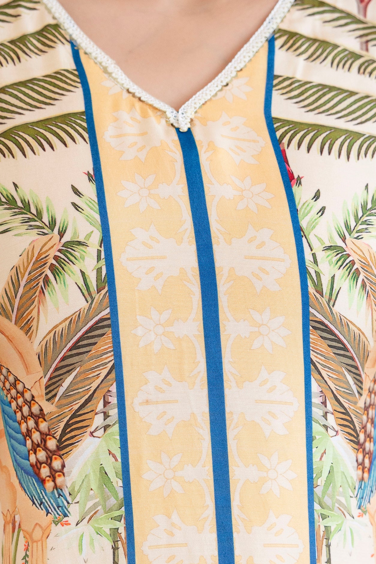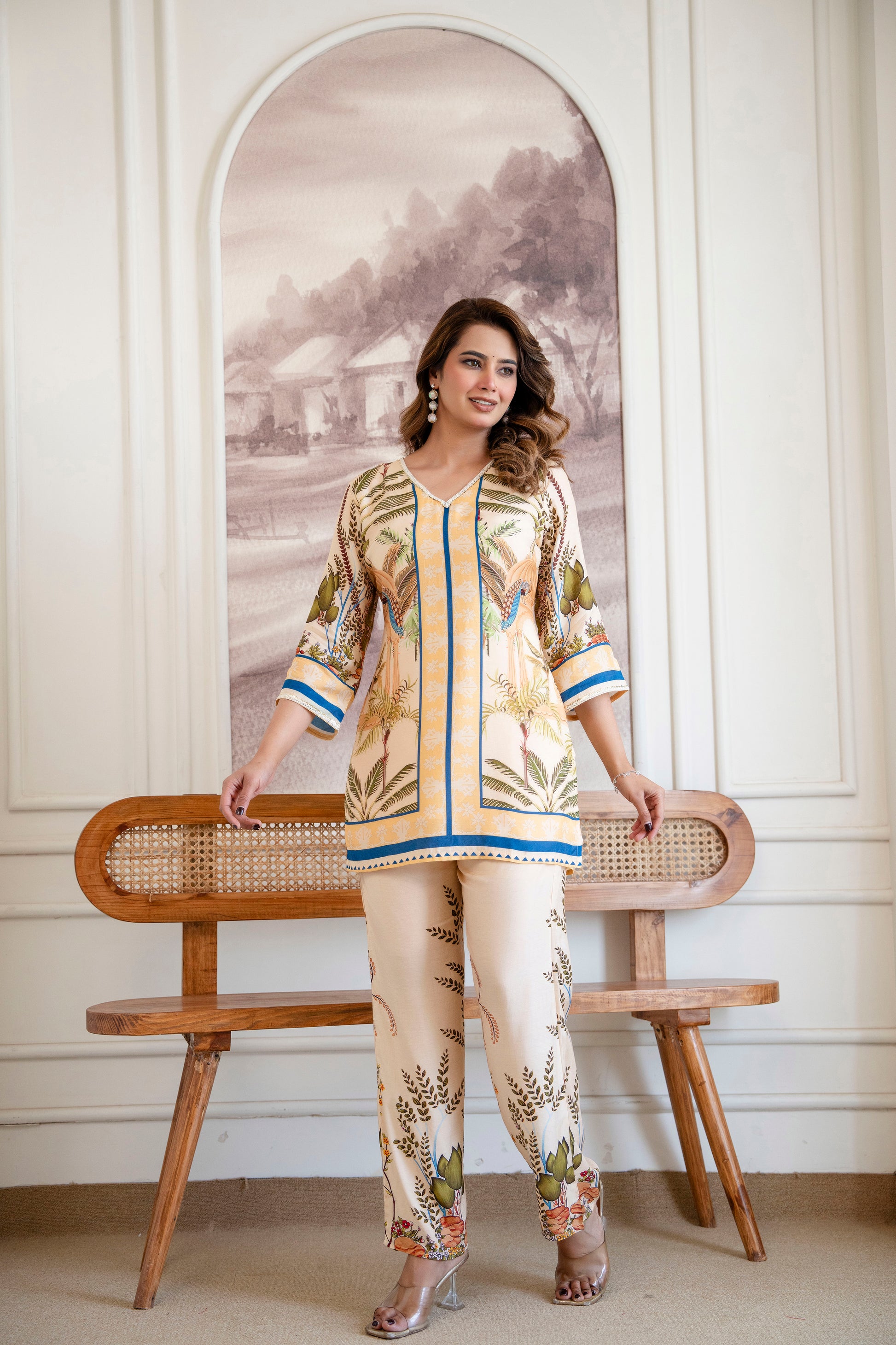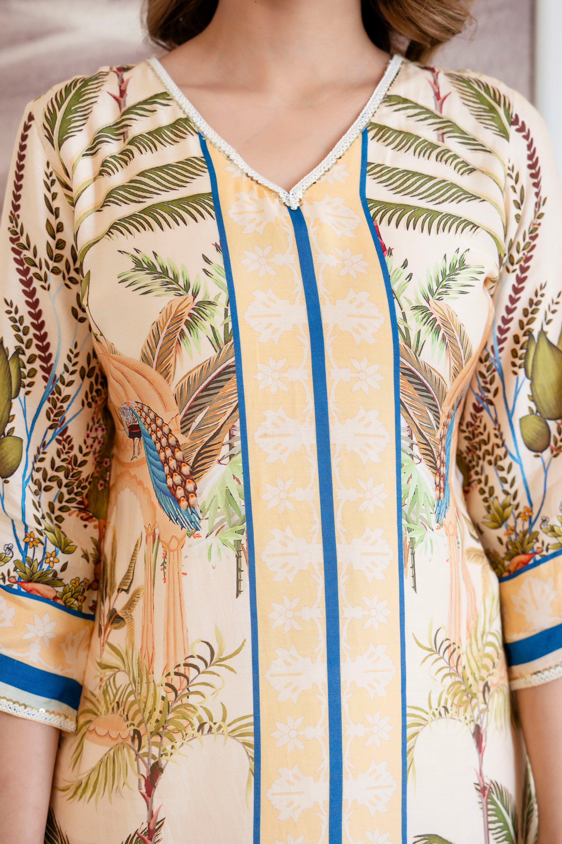 The cream canvas blooms with a sophisticated digital jungle motif — artfully placed to create depth, elegance, and statement appeal. Intricate lace detailing along the neckline, sleeves, and hemline enhances its delicate femininity, adding layers of texture and craftsmanship.