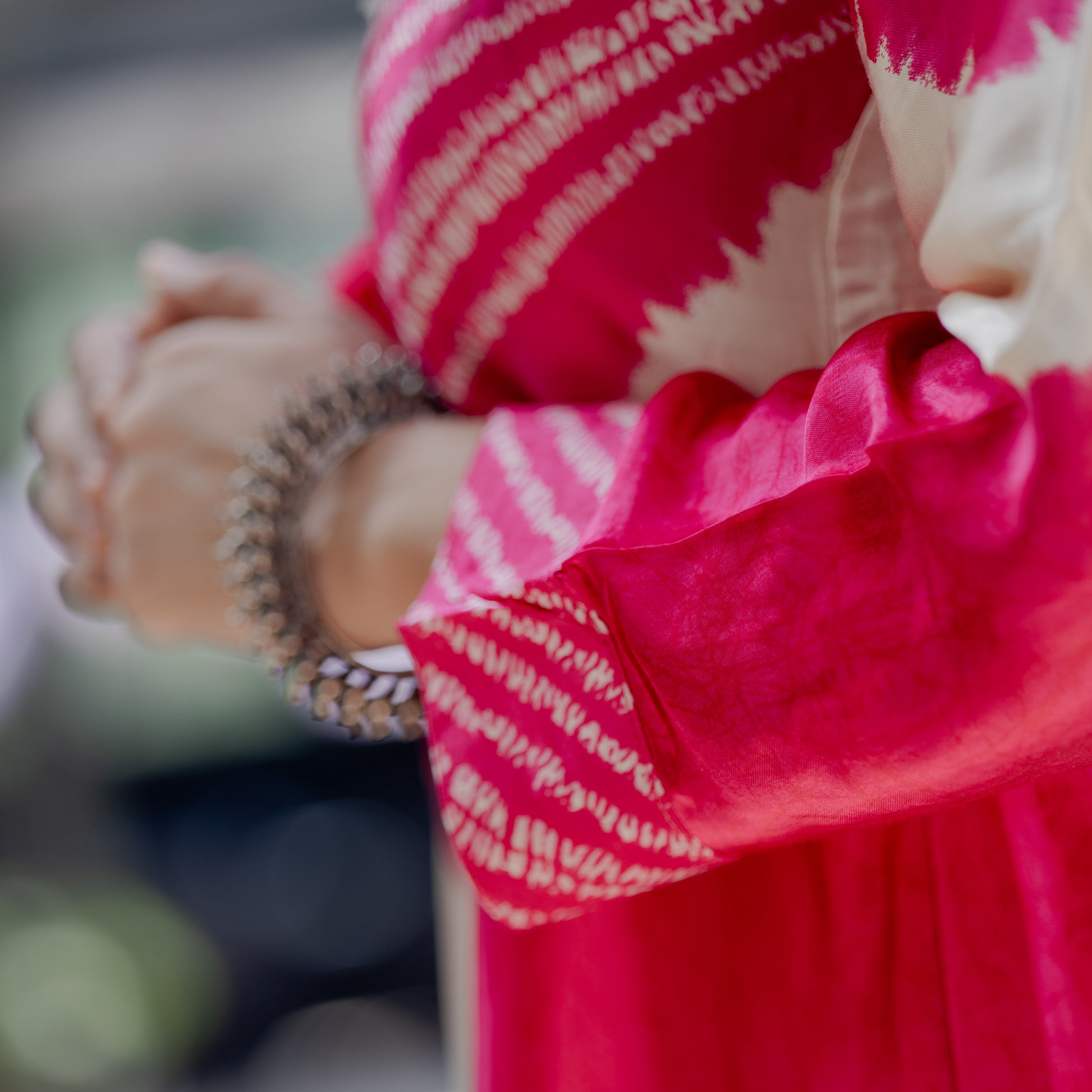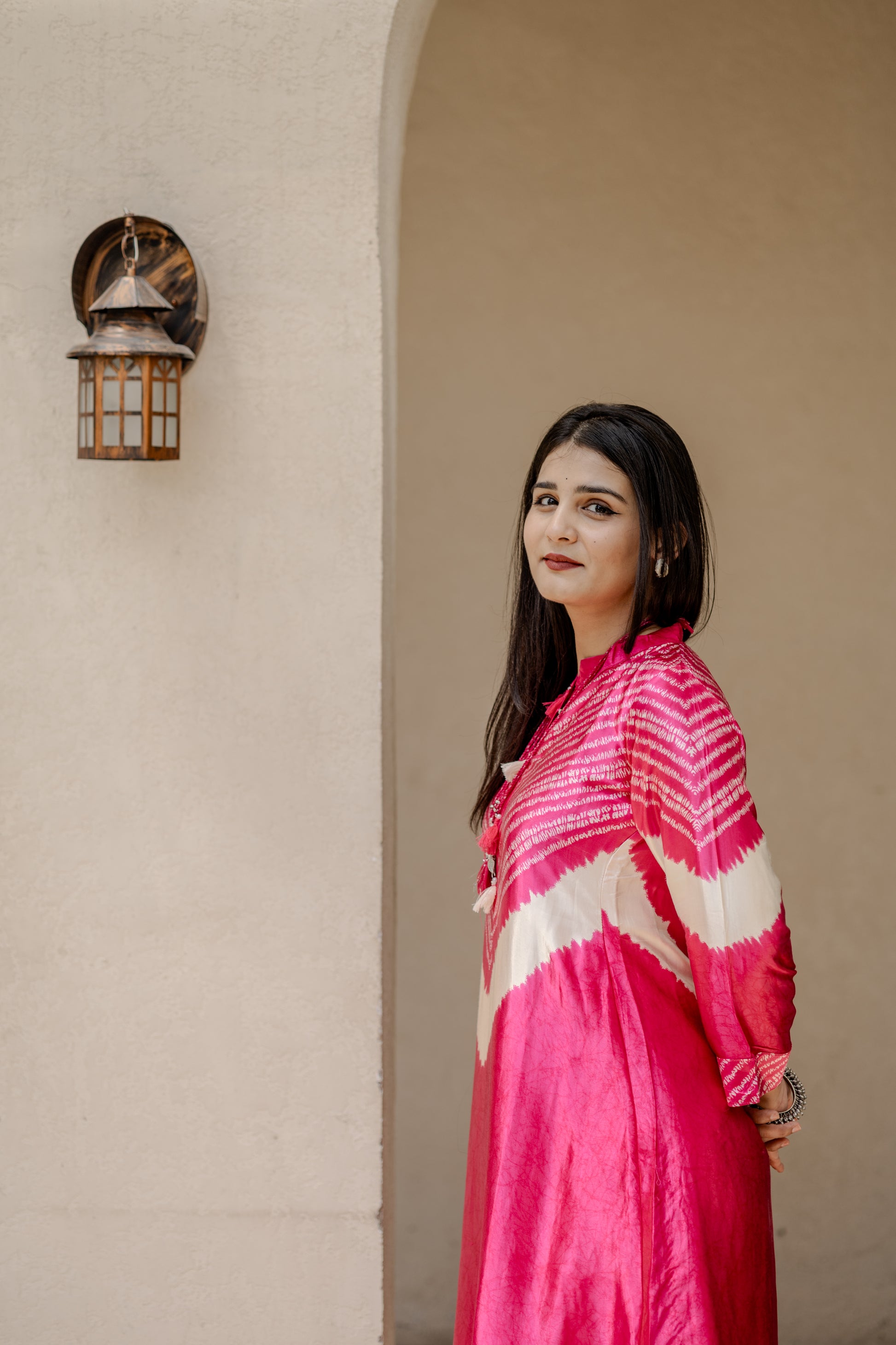 Step into timeless elegance with our Rani Pink Gajji Silk Co-ord Set, designed to add effortless charm to your festive and special occasion wardrobe. Crafted from premium Gajji silk, the kurti features delicate neck embroidery, complemented by a stylish necklace detail and coin work edges for a touch of tradition. The classic Bandehej print beautifully enhances the vibrant rani pink shade, making this ensemble a perfect blend of heritage and modern style. Pair it with statement heels or traditional juttis to complete the look.